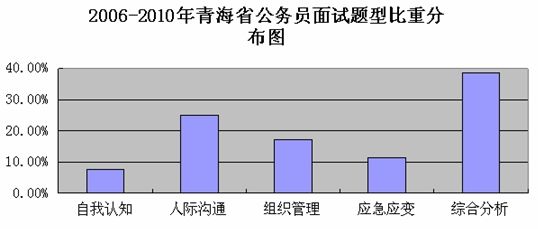 青海省公務(wù)員面試主要采取結(jié)構(gòu)化面試的形式,根據(jù)2006年到2010年的面試真題分析,可知青海公務(wù)員面試題型涵蓋很廣,包括結(jié)構(gòu)化面試的五大基礎(chǔ)題型,題型分布如下圖: